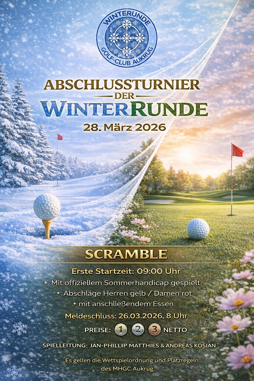 am 28.03.26 findet das Abschlussturnier der Winterrunde statt. Gestartet wird ab 9:00 Uhr ab Tee 1 und 10 zum 3er Scramble.